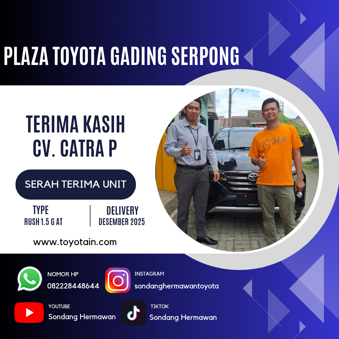 Perkenalkan, saya SONDANG HERMAWAN, Sales Executive Plaza Toyota Gading Serpong. Terima kasih atas waktu dan kunjungan Anda ke website saya.